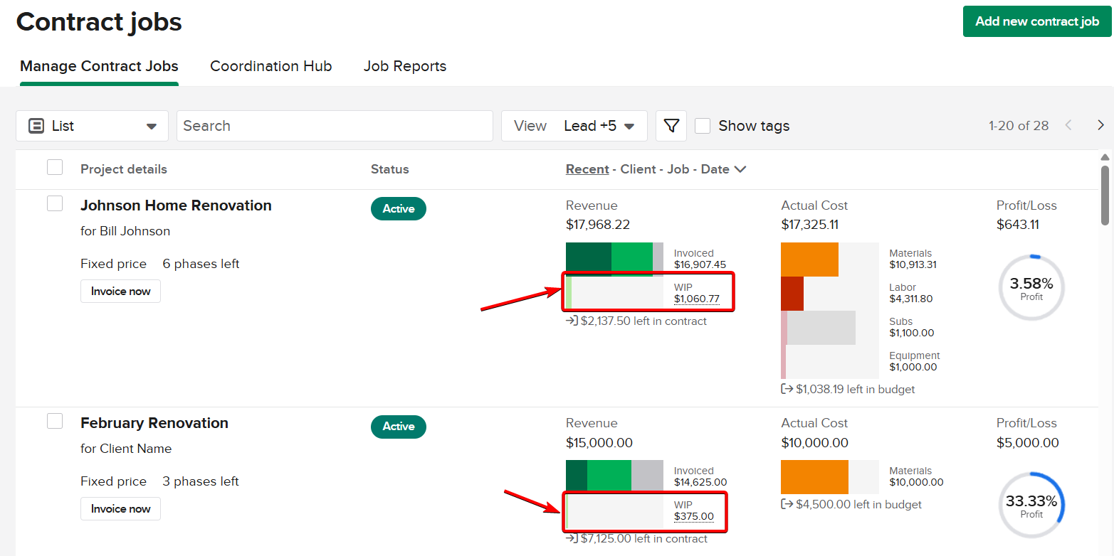 Knowify uses this number to show you how far along you are on a project and how much of the contract value you have earned on a project before you have invoiced the client. Once you enable WIP in Knowify, may notice this number in the profitability charts in the Contract Jobs section.