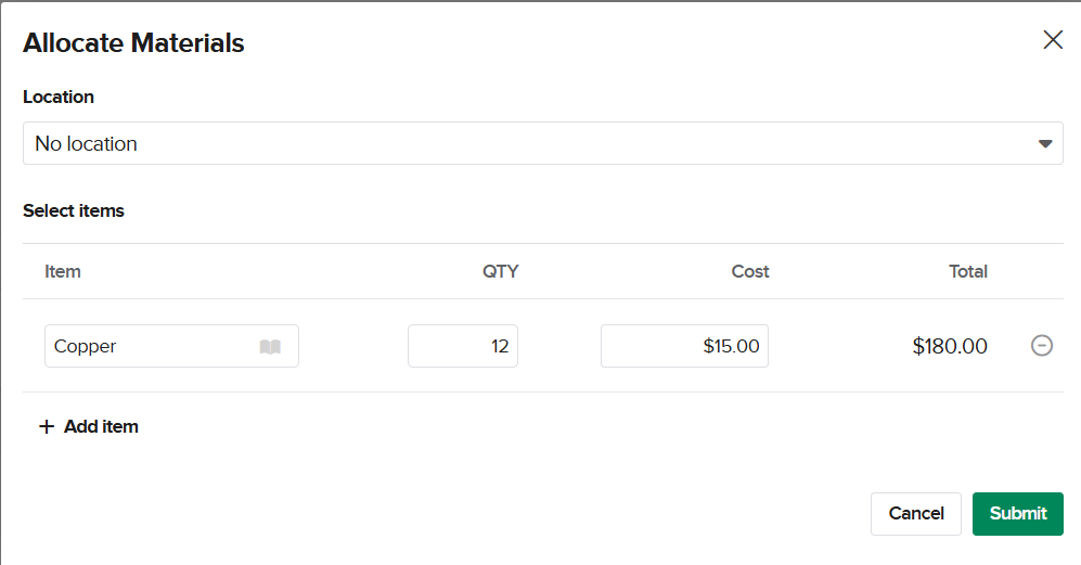 To enter material cost on a job without entering a purchase or a bill, you can use a Catalog Allocation. This is useful for items used on a job from your inventory or stock that did not require a vendor interaction. If you are using Knowify's Parts Management feature please refer here for more information