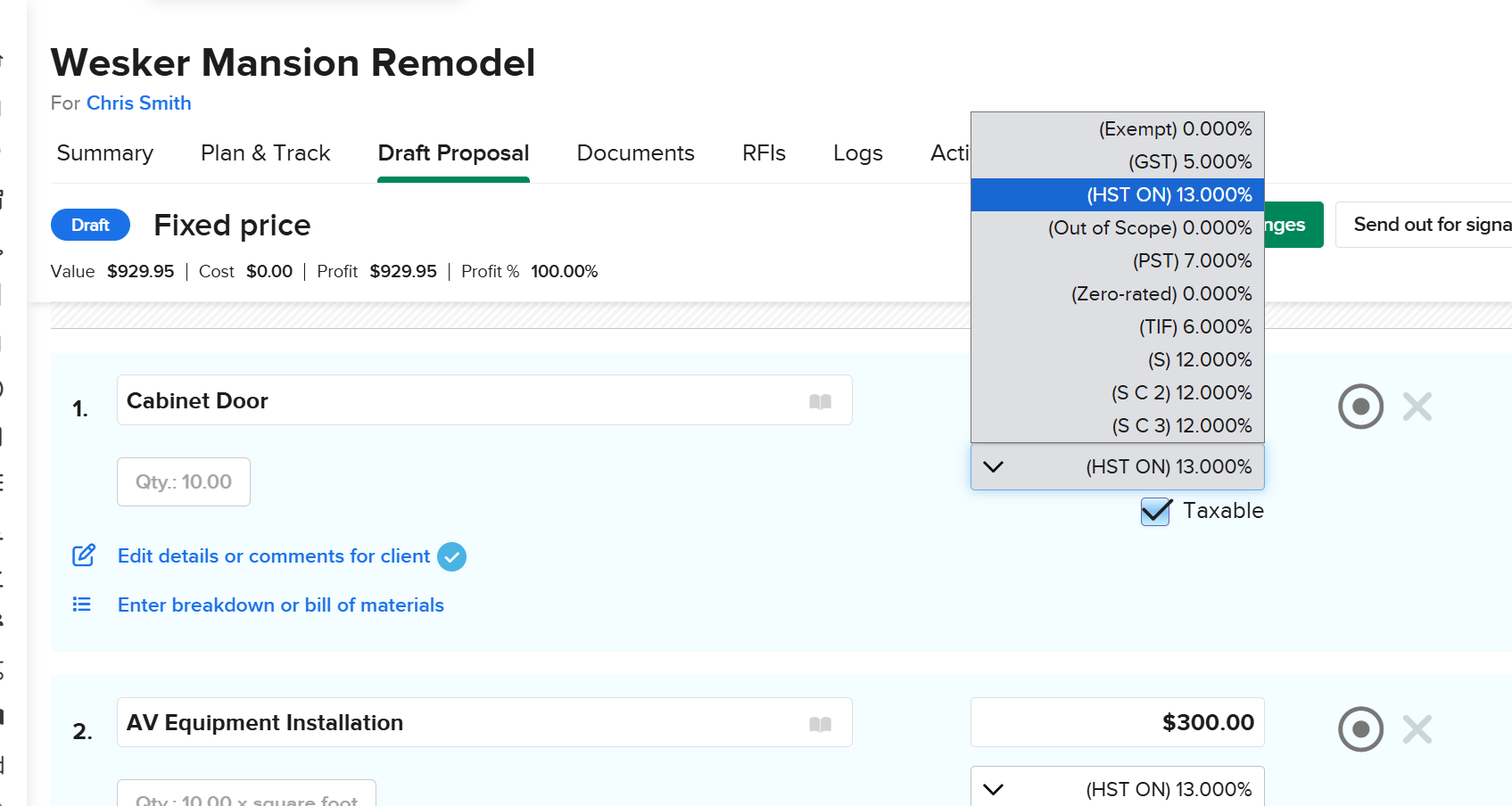 Knowify allows you to set tax rates on your draft proposal and automatically apply these to selected line items on your project.