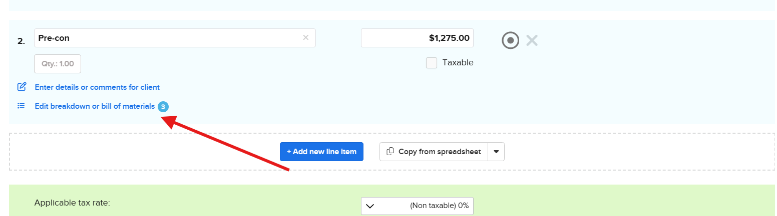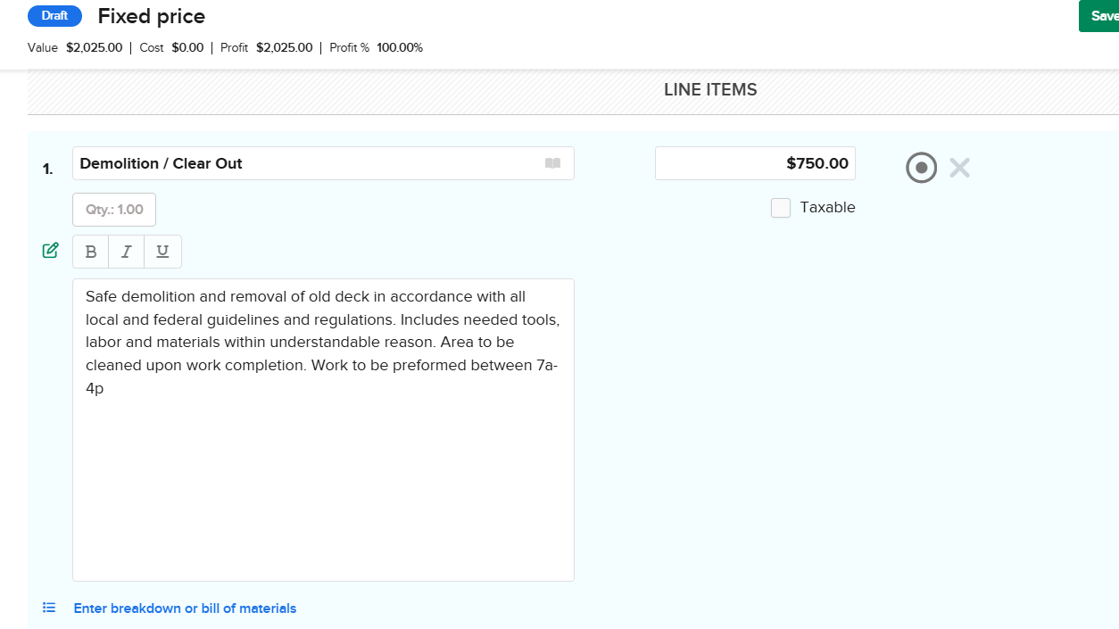 This will add a text box in which you can write a general description of the line item, including details, notes, inclusions, exclusions, and any other information needed!