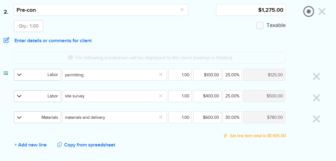 To add a general description to any line item, click the 'Edit Details or Comments for Client' button under the line item's name