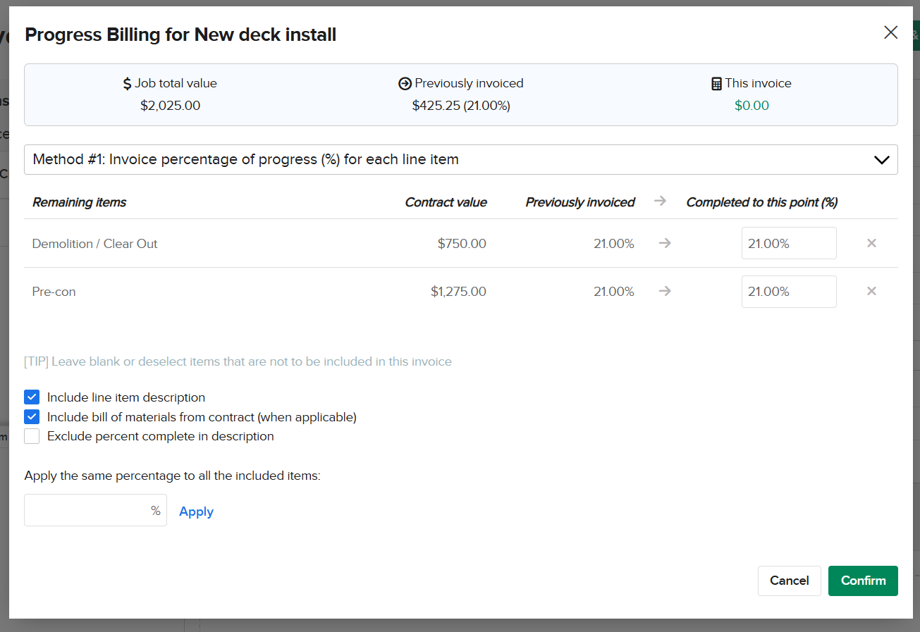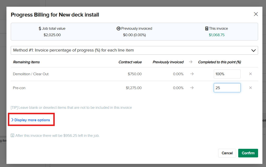 You are able to include your line item details on invoices as well! When you are First creating an invoice, Knowify will generate a progress billing prompt asking how much you would like to invoice for. Select display more options: