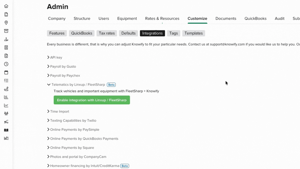 How to connect your FleetSharp account and activate live equipment tracking in Knowify