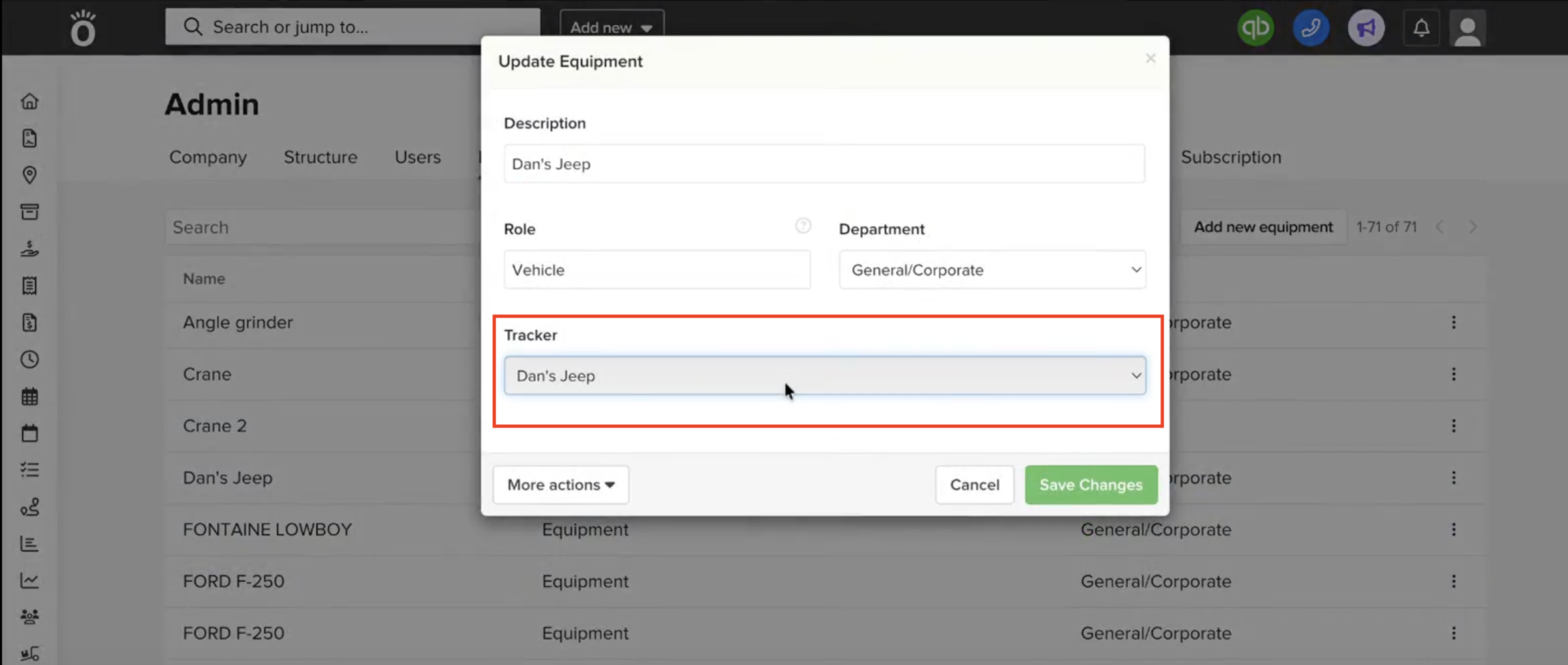 If your account is connected to FleetSharp, you'll see a new field in the Equipment section that allows you to associate each piece of equipment to a FleetSharp tracker. This step links FleetSharp trackers to your existing equipment so they can appear on the Activity Map in Knowify with live status and location pulled from FleetSharp.