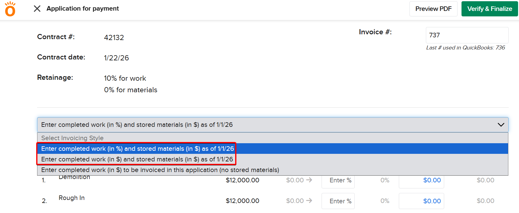 When creating the first invoice on the job, be sure to choose a billing method that includes stored materials