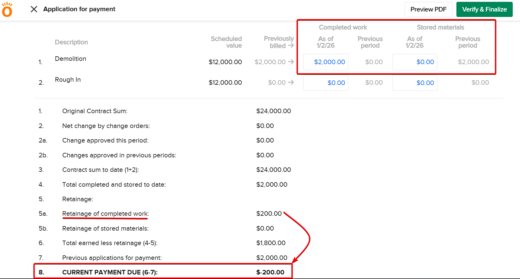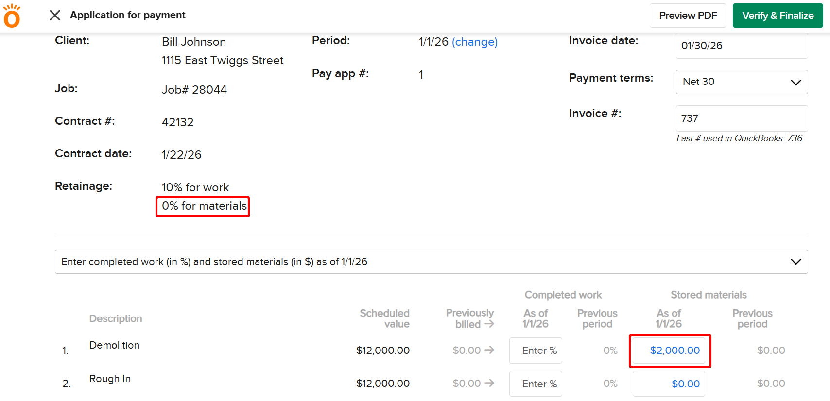 On the next invoice (or any future progress invoice for this job) you can $0 out the stored materials and move the value into work completed. Note that the value of the invoice does not increase since we already collected these funds as stored materials, however when moving the value to work complete, it will be subject to any retention we have set for work/labor: