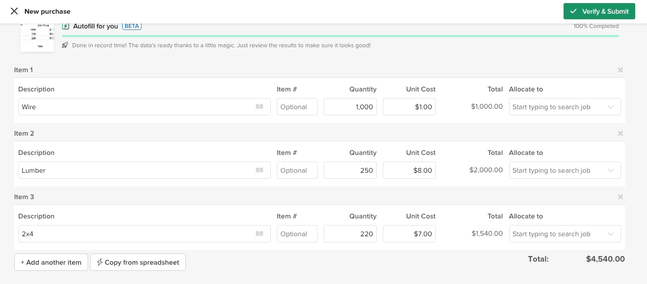 The purchase will update job costing and sync with QuickBooks (if sync is enabled).
