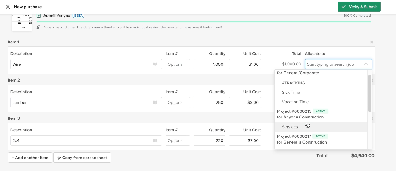 Knowify’s AI-powered expense auto-entry can create purchase orders for you in seconds. Just snap a picture or upload a copy of your receipt and Knowify will automatically pull in all the expense details, turning your receipts into real job cost data in seconds.