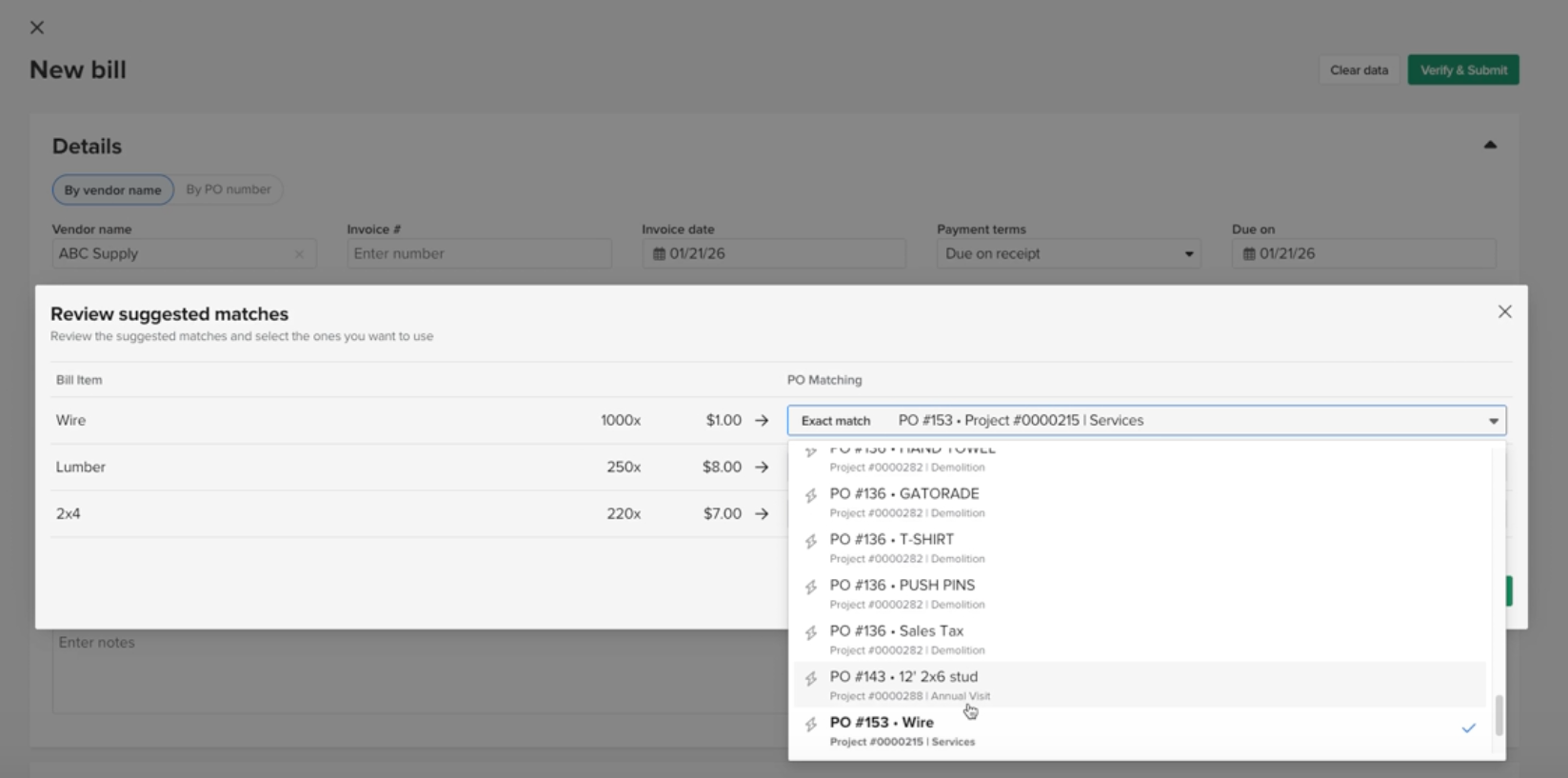 Before creating the bill, Knowify will attempt to match each item on the bill with similar line items in any open purchase order with the selected vendor (based on name and quantity). Exact or close matches will be suggested automatically. You can choose to:
