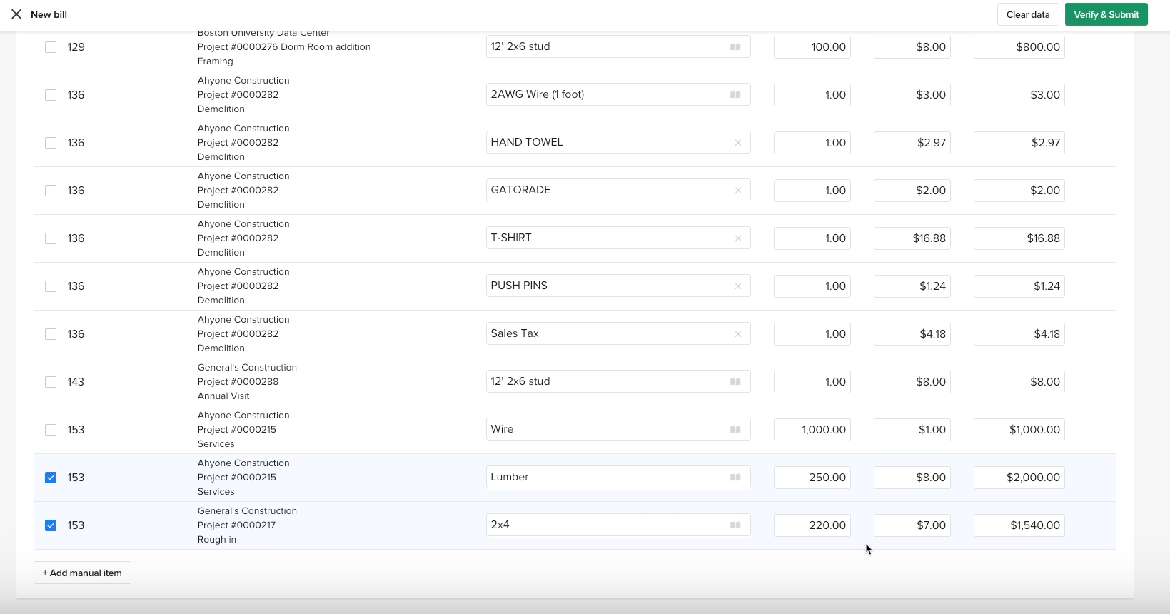 Before continuing, make sure to confirm each line item, including the item description, quantity, and cost. If you need to, you can manually edit descriptions, quantities, unit costs, and item selections for each line item.