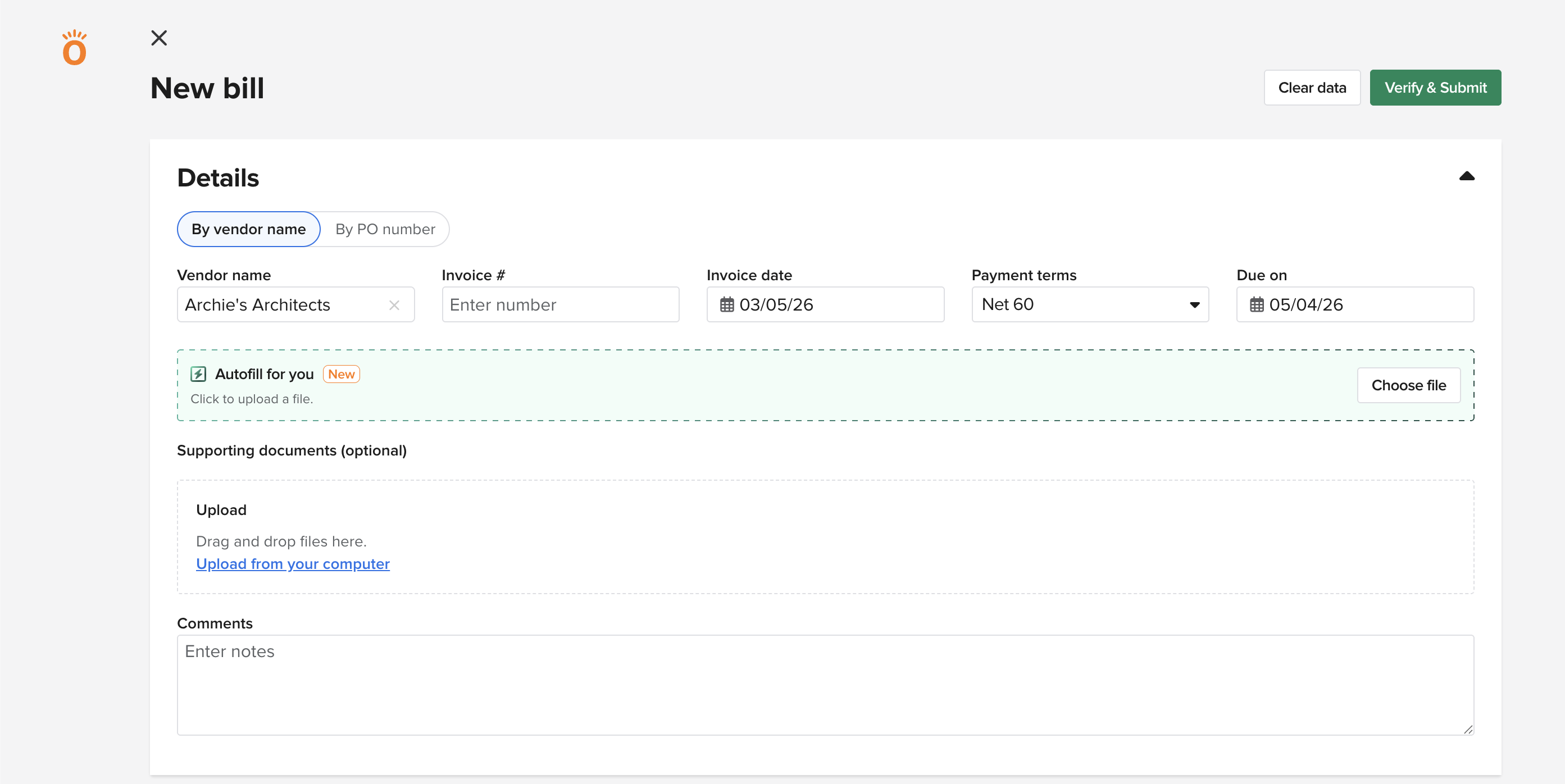 In the auto-fill for you box, click choose file to browse and upload a vendor invoice.