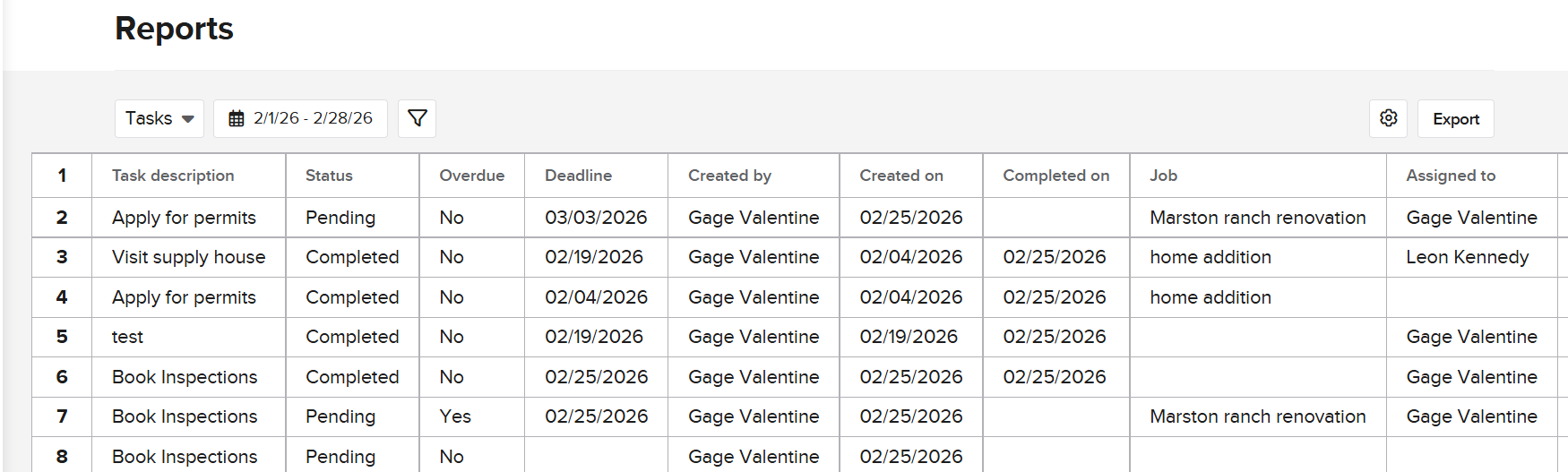 The Tasks Report is a record of all tasks created within a specified time frame, as well as a summary of the tasks, including creation date, related job (if any), and who it was assigned to: