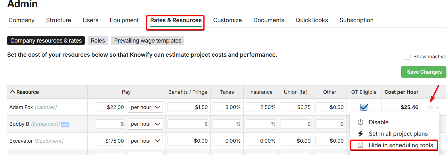 If you need to track time or budget labor cost for a given resource/employee but do not want their name to display in the scheduling sections of Knowify, you can disable an individual in the admin section of the account.