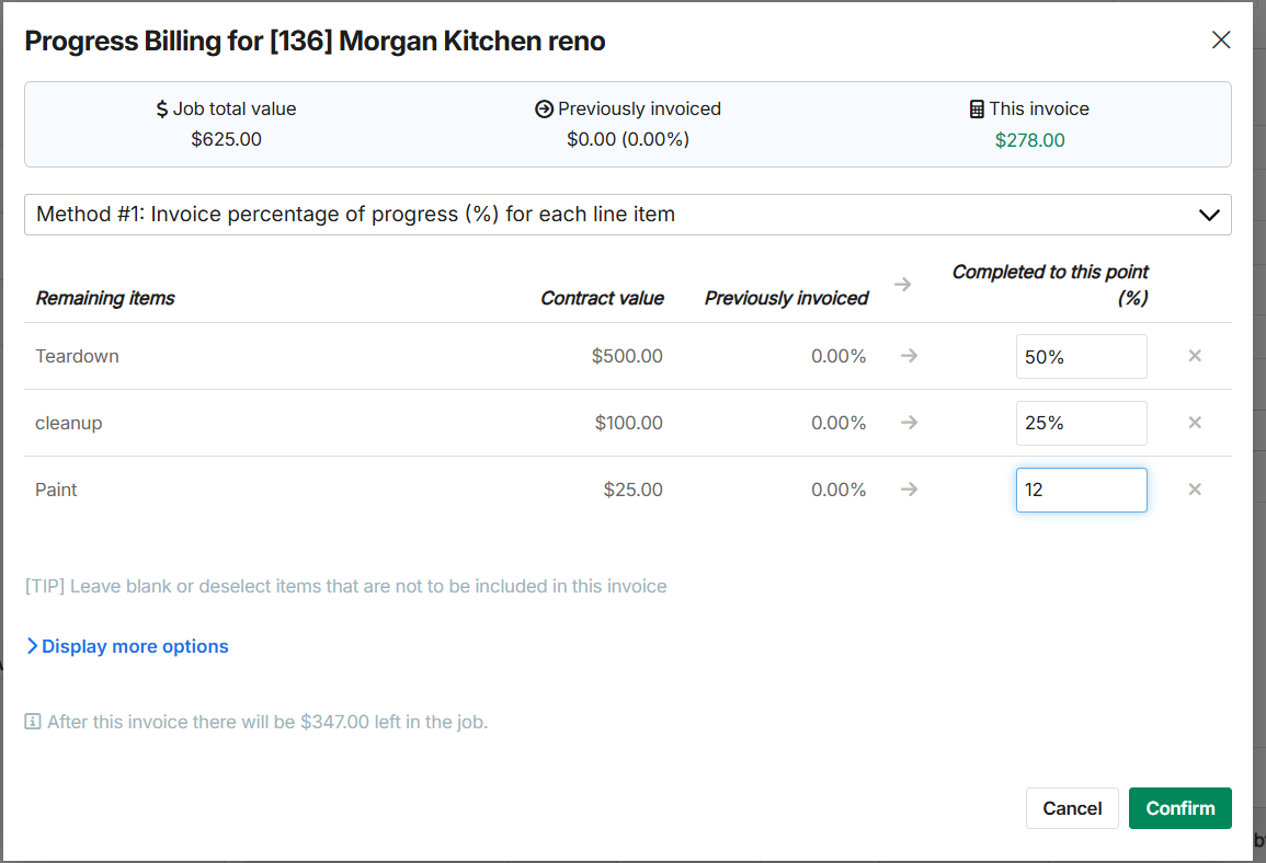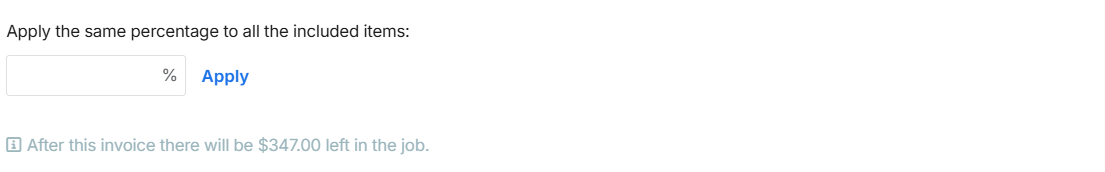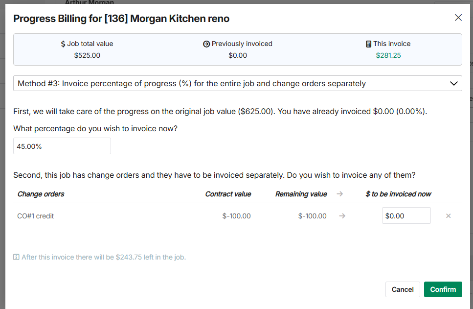 With this method, Knowify will treat the entire job as one line item for invoicing. Enter the percentage of completion for the job as a whole from 1-100%. Any Change orders are counted as a separate line items, and can be invoiced individually by dollar amount.