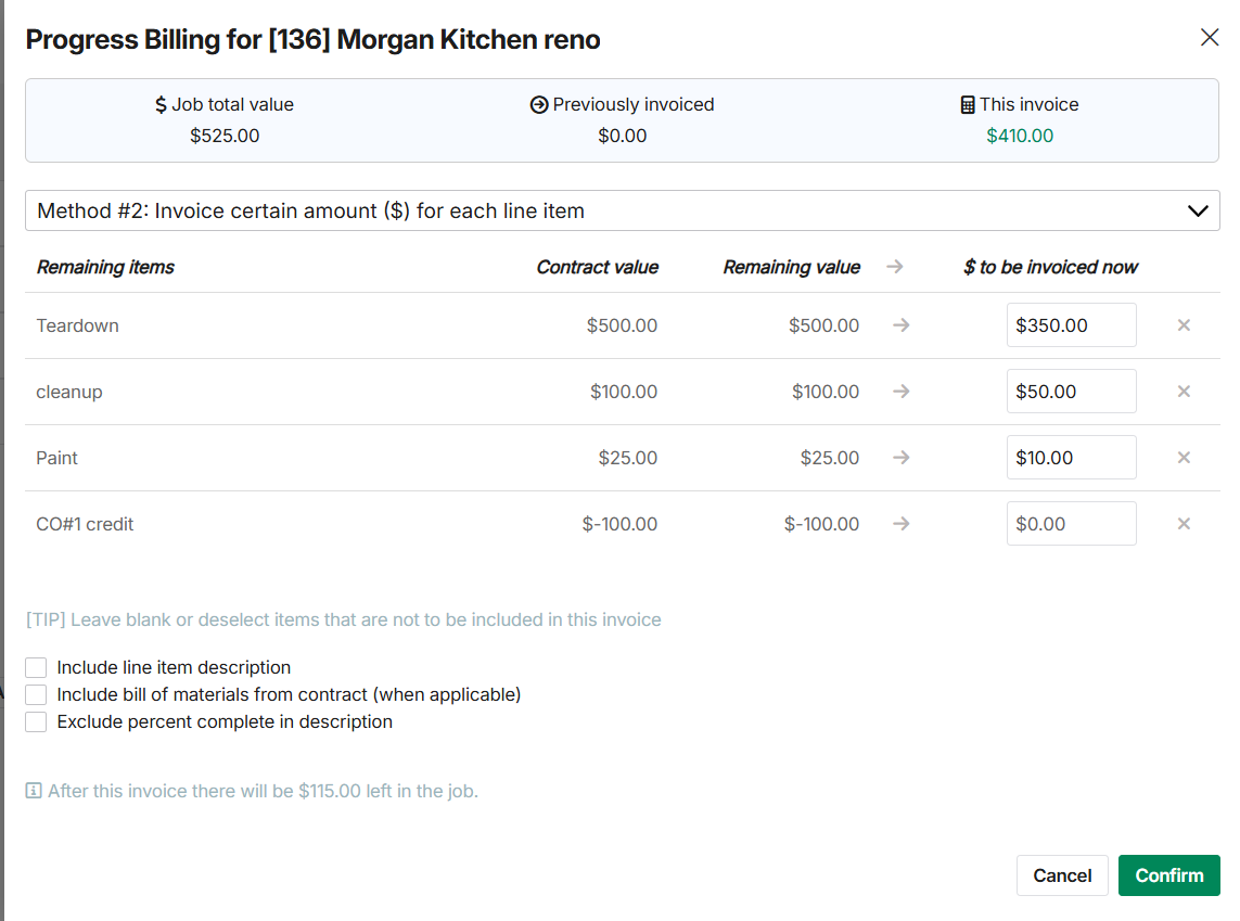 With this method, Knowify will treat the entire job as one line item for invoicing. Enter the exact dollar amount you wish to bill for, up to the full contract value of the job. Any change orders are counted as a separate line item, and can be invoiced individually by dollar amount.