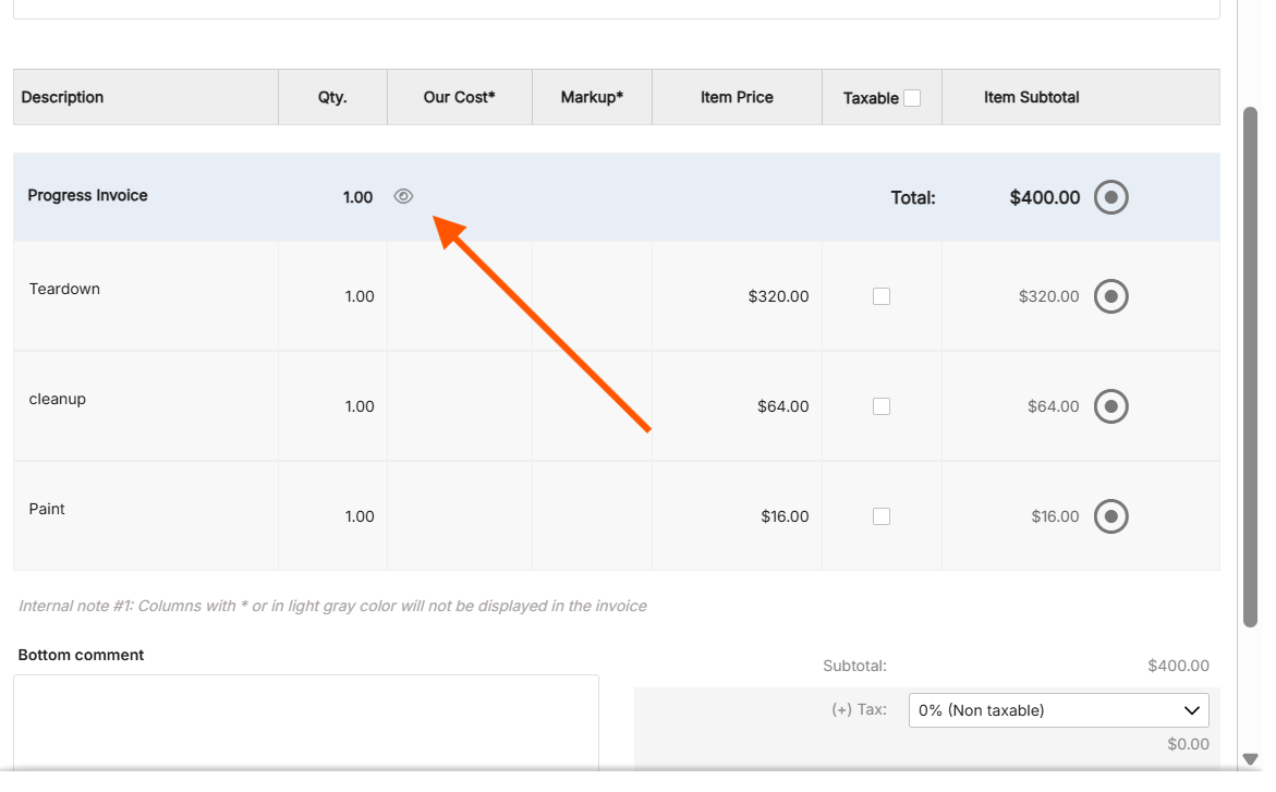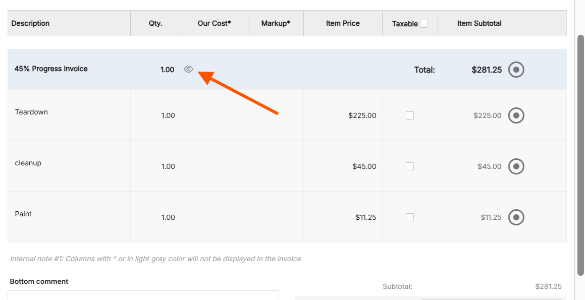 Knowify will break this amount up across all line items based on the total value of each line item. You can toggle between only showing the total progress amount you are billing for, or fully display each line item by clicking the eye icon on the Preview Invoice screen
