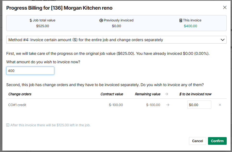 Method 4: Invoice certain amount ($) for the entire job and Change Orders separately