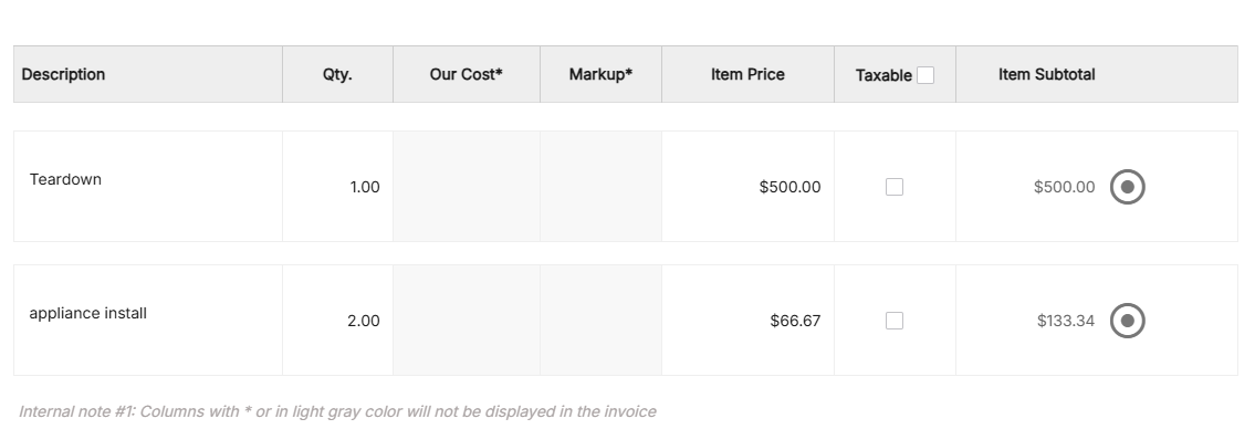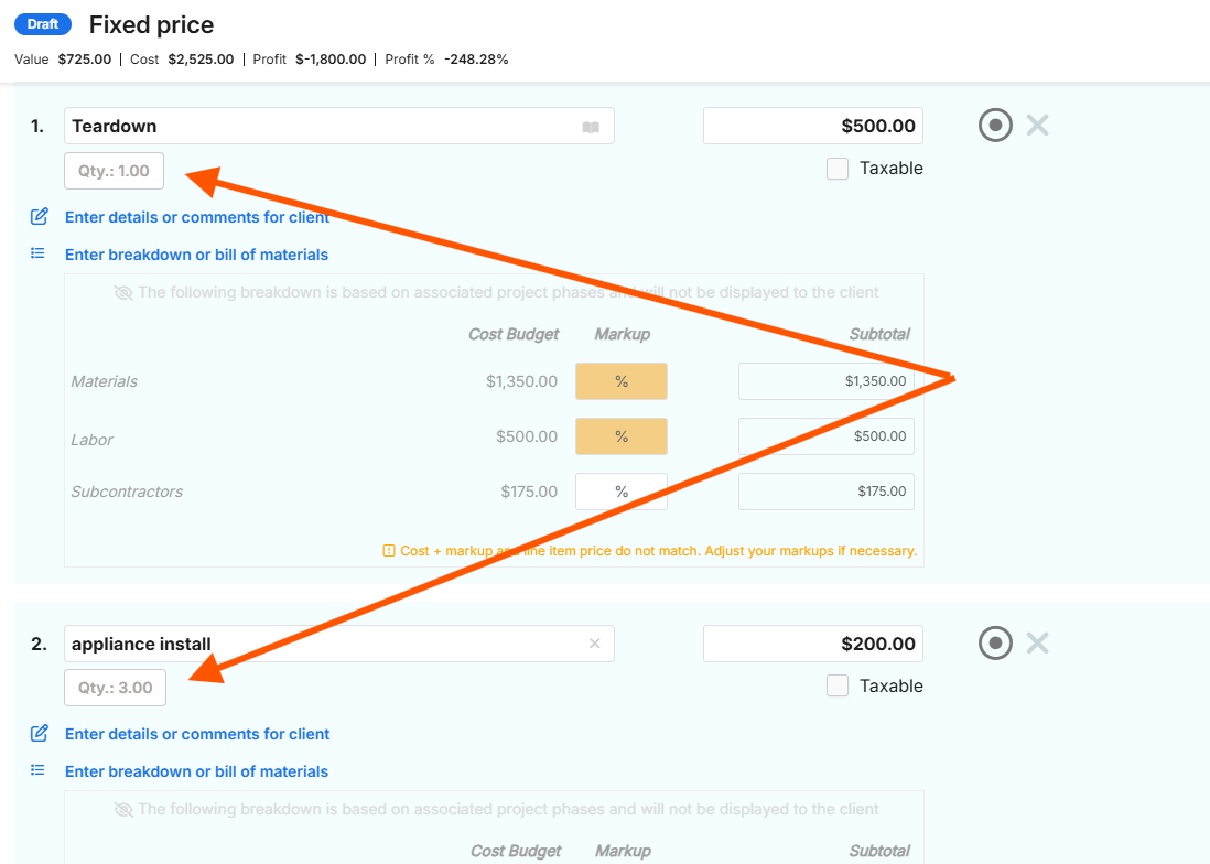 When creating your invoice, input the number of units you are going to be invoicing for, between one and the total number you have input on your proposal. Knowify will calculate how much is due for each line item based on the number of units being invoiced for and the total price of the line item.